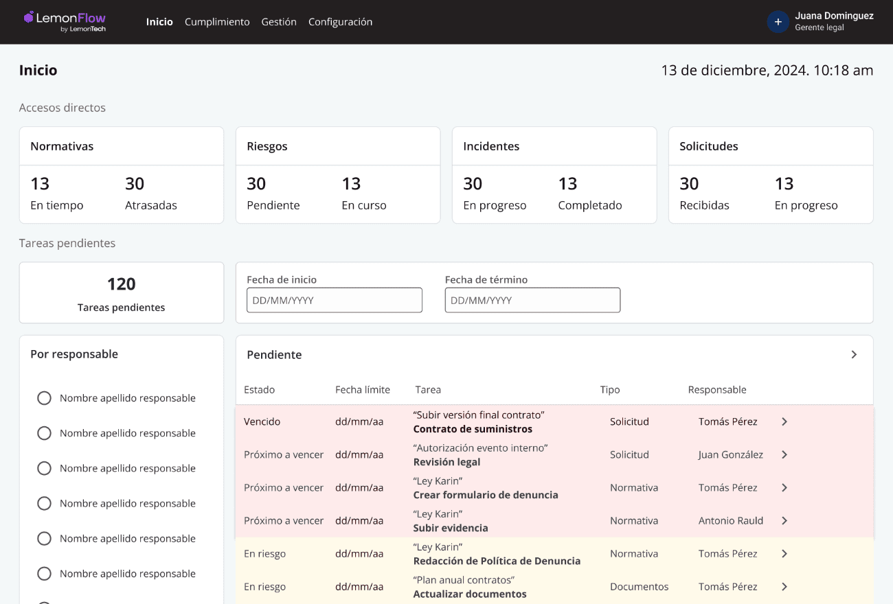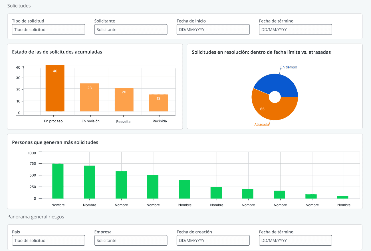 Automatiza tareas repetitivas, centraliza los requerimientos y permite asignar responsables de forma clara. Así, el equipo jurídico puede enfocarse en tareas estratégicas sin perder visibilidad del flujo operativo.