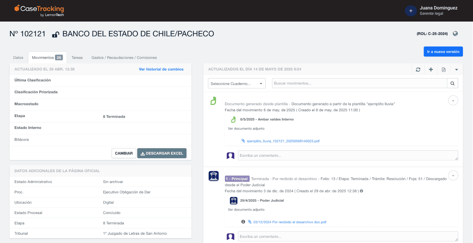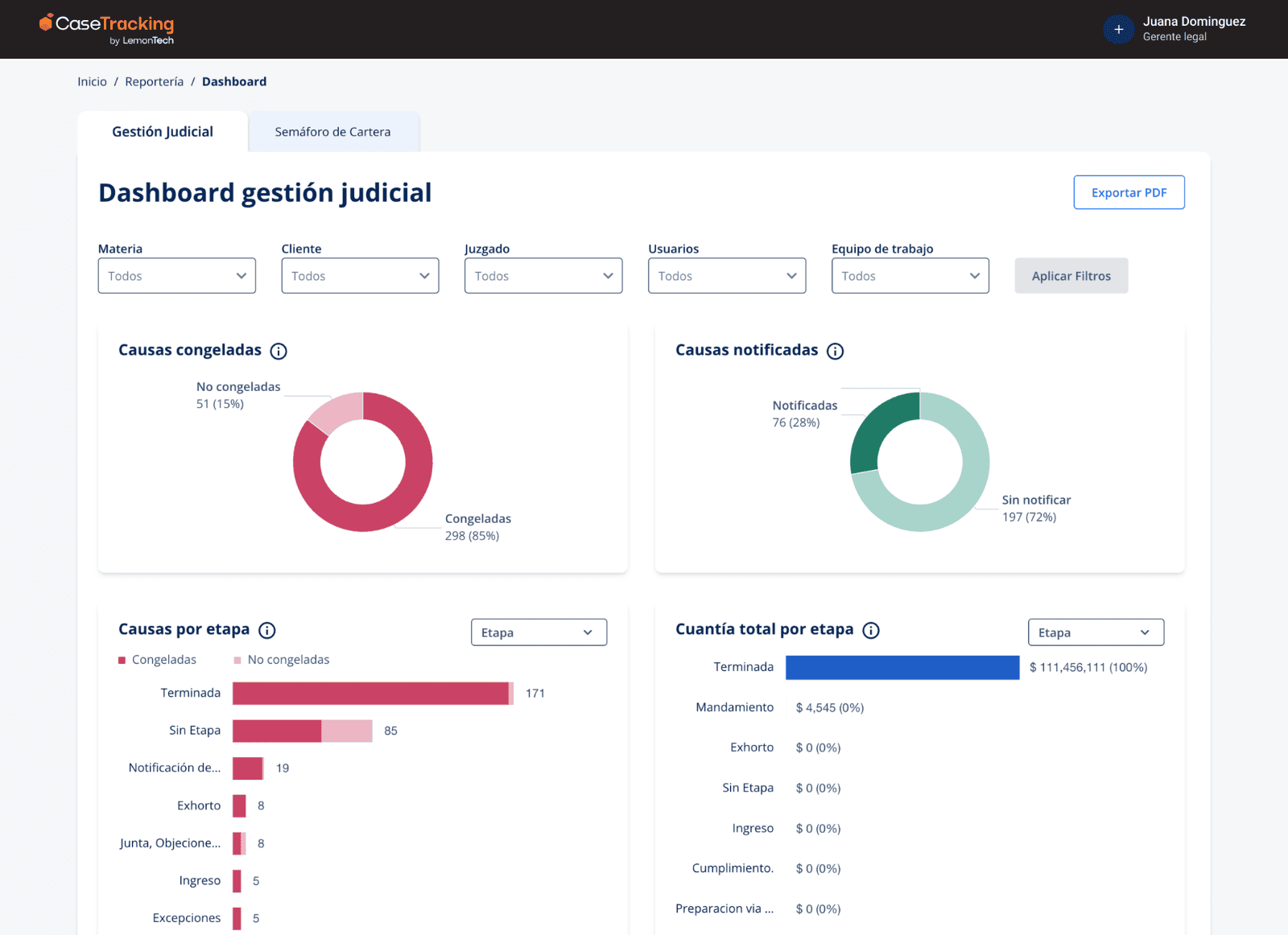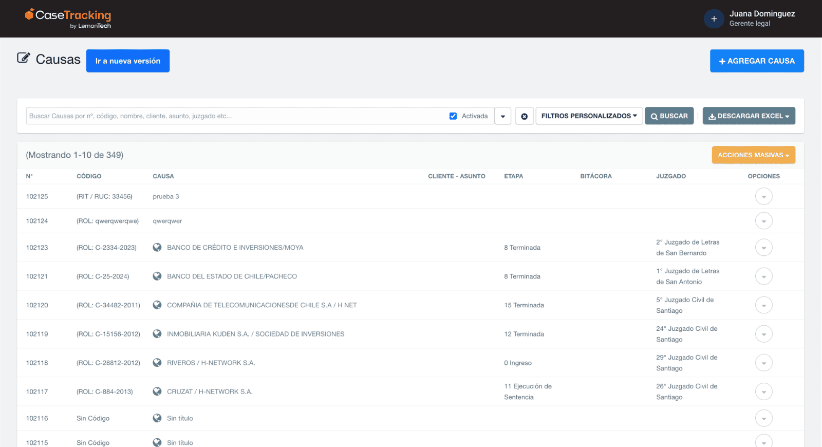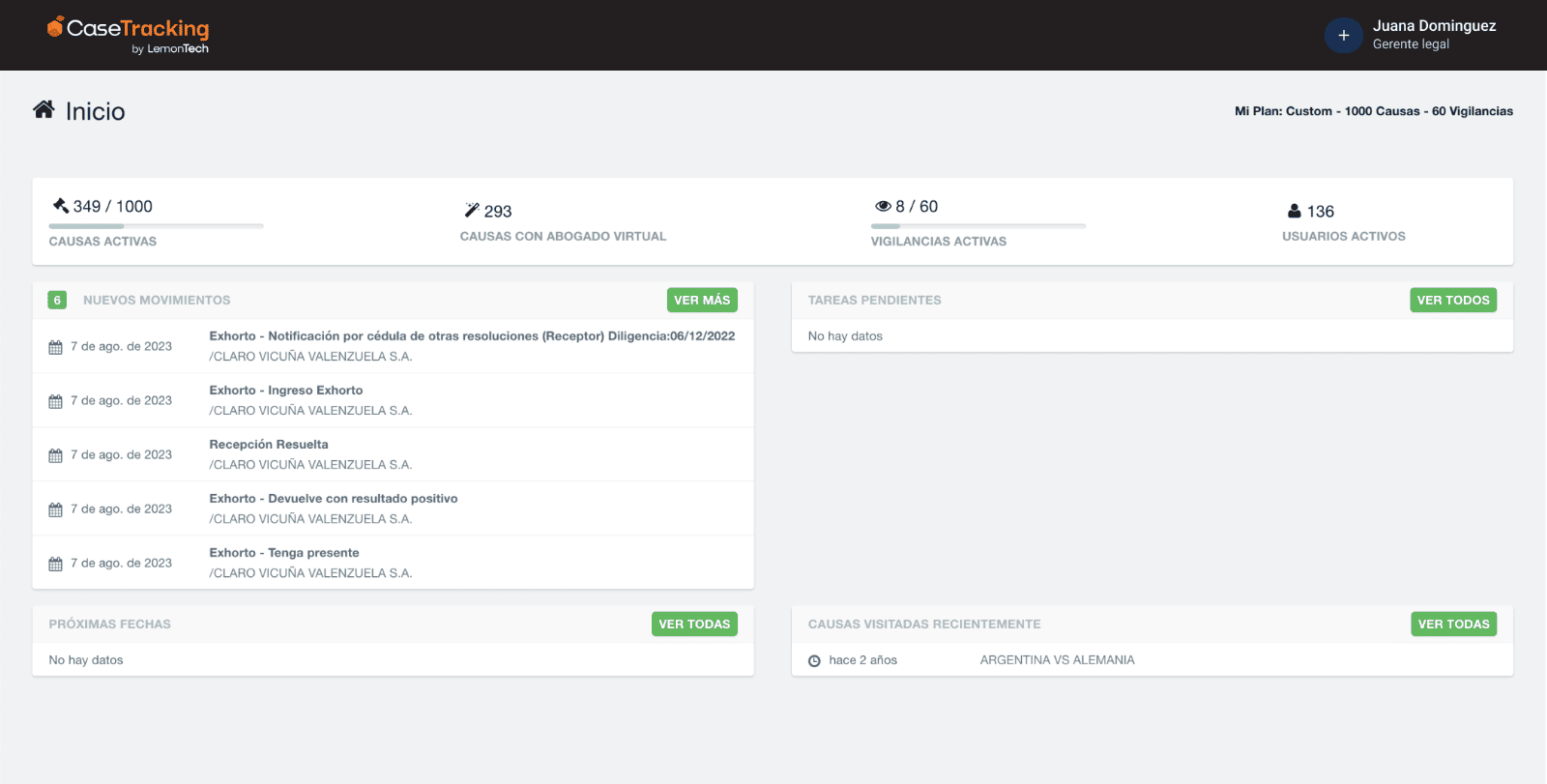 Seguimiento de causas | Revisión manual de expedientes. Movimientos judiciales desordenados y difíciles de filtrar. | Trazabilidad completa del proceso y visualización del impacto en el negocio. Clasificación automática de movimientos y priorización de tareas. |