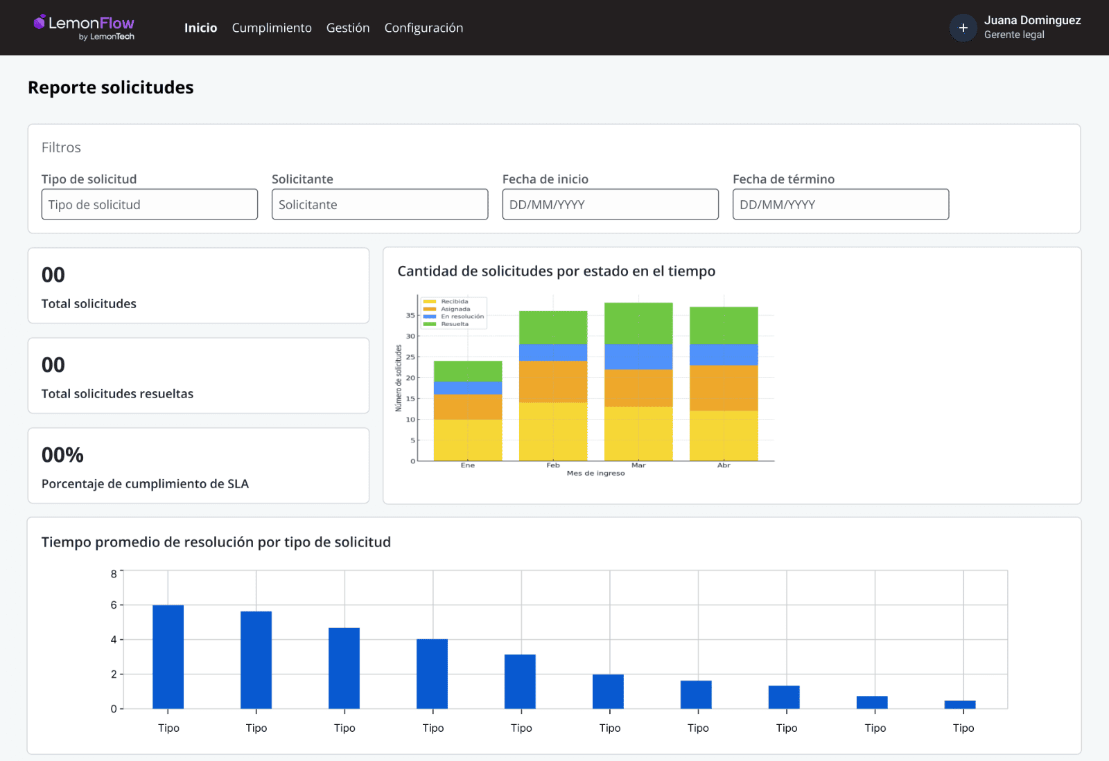 Visibilidad y justificación del impacto legal | El área legal opera sin datos claros. No puede demostrar carga de trabajo, cumplimiento ni justificar presupuesto ante la dirección. | Entrega dashboards con KPIs legales personalizables, reportería automatizada y métricas en tiempo real. Te permite mostrar impacto, justificar decisiones y liderar con evidencia. |