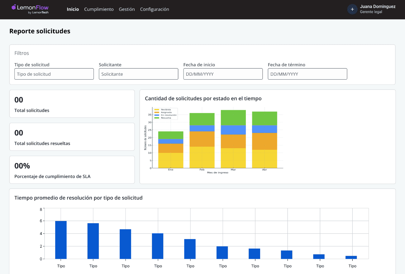 Automatiza tareas repetitivas, centraliza los requerimientos y permite asignar responsables de forma clara. Así, el equipo jurídico puede enfocarse en tareas estratégicas sin perder visibilidad del flujo operativo.